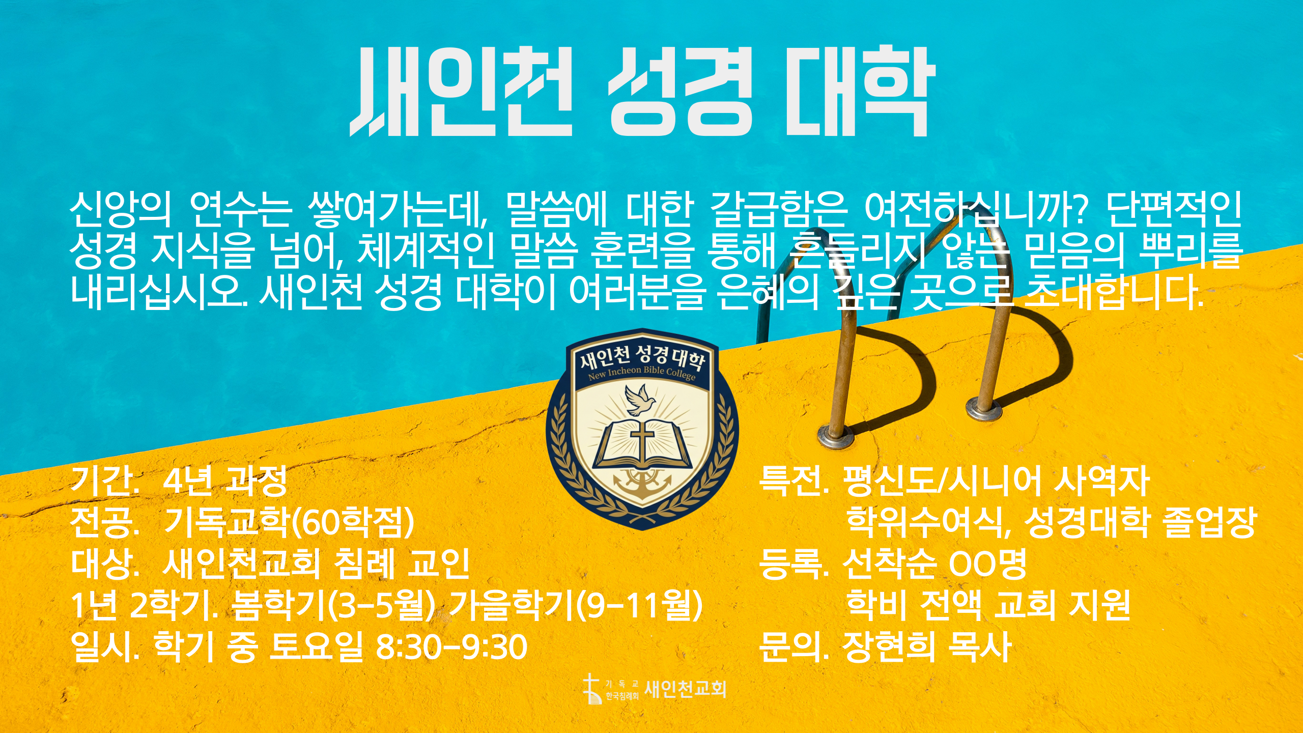 신앙의 연수는 쌓여가는데, 말씀에 대한 갈급함은 여전하십니까? 단편적인 성경 지식을 넘어, 체계적인 말씀 훈련을 통해 흔들리지 않는 믿음의 뿌리를 내리십시오. 새인천 성경 대학이 여러분을 은혜의 깊은 곳으로 초대합니다.